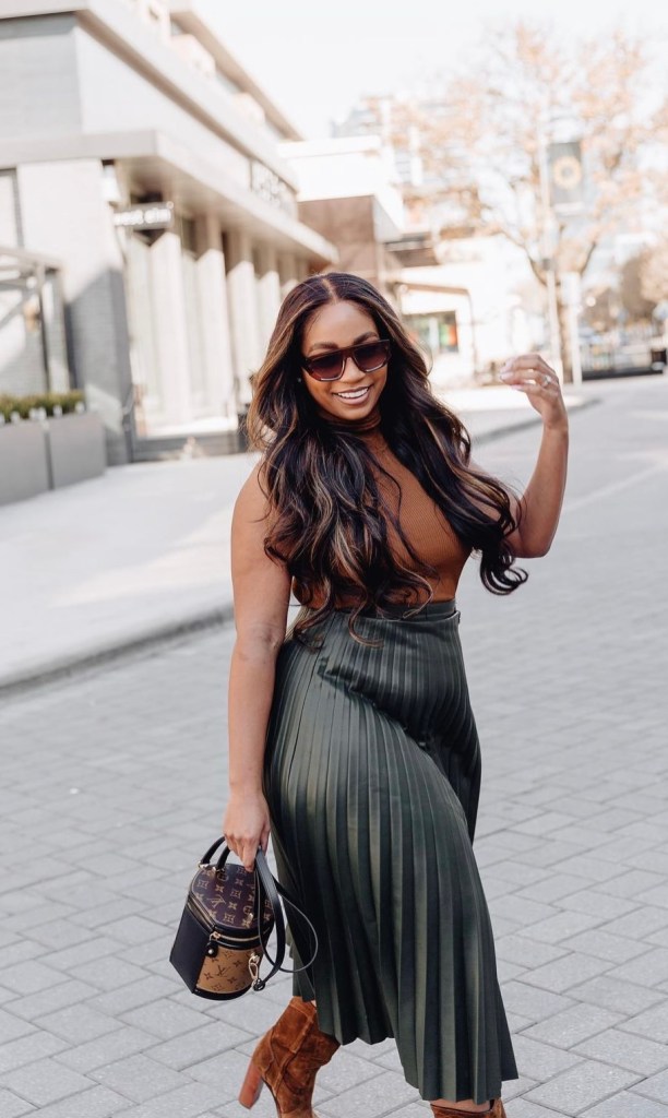 The image above is a true classic. Nothing says feminine and sexy like a classic pleated skirt and turtleneck sleeveless top. This elegant, well-executed look simply cannot be beat, as it nails every aspect of the perfect outfit right on the head! Classic? Feminine? Sexy? Modern? Check.