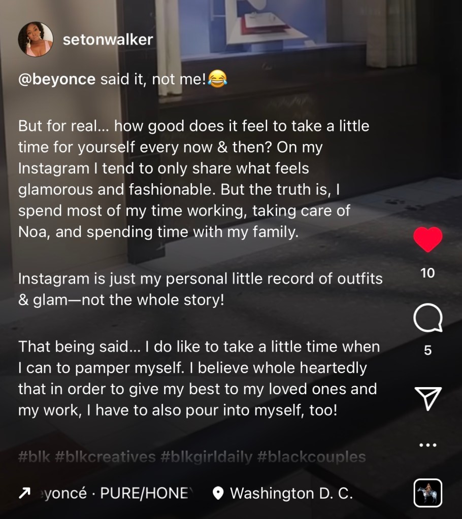 Like many others, I do control what I share on social media. I have a passion for fashion and luxury, and so that is primarily what I share. Aside from content creation, I am a mother, a wife, a friend, a daughter… I have a job and I run errands and I change diapers just like most working mothers. Most of this I keep private from my social accounts, and that is my prerogative. The point is that there is much more that goes on behind the scenes, and that fashion and content creation is simply a fun way for me to unplug!